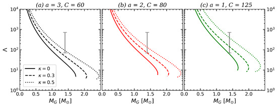 where is the compactness of the star and is the tidal Love number [47]. In the three panels in Figure 6, a general feature observed is the steep decrease in with increasing . Alongside this trend, as the parameter increases, there is an intensification of repulsive forces within strange quark matter, leading to greater tidal deformability at a fixed . The error bar represents the estimated tidal deformability of a 1.4 neutron star from GW170817, which is at the confidence level. Notably, the model with aligns more closely with the GW170817 error bar, particularly when compared to the model with , where compatibility is only observed for . This difference can be understood through the impact of the parameter on tidal deformability. As seen in Figure 5, decreasing a shifts the curves toward regions of larger radii, reducing compactness and enhancing tidal deformability.
