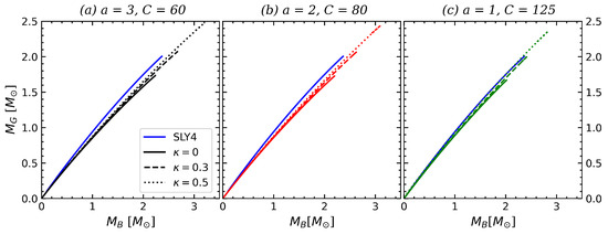 In all panels in Figure 7, the curves demonstrate that as increases, the slope of the curve becomes steeper. This suggests that a higher value, indicative of stronger repulsive interactions within the neutron star, leads to a higher gravitational mass for the same baryon mass. Generally, the curves in Figure 7a exhibit a steeper slope than those in Figure 7b, which, in turn, are steeper than those in Figure 7c. This pattern is associated with the fact that stiffer EOSs (see Figure 3) result in a greater gravitational mass for a fixed baryon mass. Consequently, as the parameter a decreases, the energy released decreases, as evidenced by the narrowing gap between the SLY4 and SQM curves.