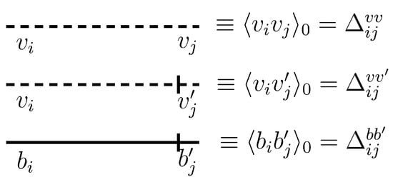 The starting point of perturbation methods in quantum field theory is to express Green functions in terms of a corresponding sum of Feynman diagrams, whose relevance is controlled by interaction parameters (coupling constants). Throughout this text, by Green functions, we mean both correlation and response functions of the fields. These functions are derived from the functional averages of specific field products, weighted by the exponential of the action . In graphical terms, these objects can be represented by Feynman diagrams constructed according to the standard diagrammatic rules of quantum field theory. The Feynman diagram technique serves as a convenient graphical tool for organizing various algebraic structures that arise from the basic perturbation theory elements (propagators and interaction vertices) [29]. The graphical representation of these elements can be straightforwardly obtained. For completeness, we also present the necessary expressions here. In the frequency–momentum representation, the nonvanishing propagators of the model are expressed as