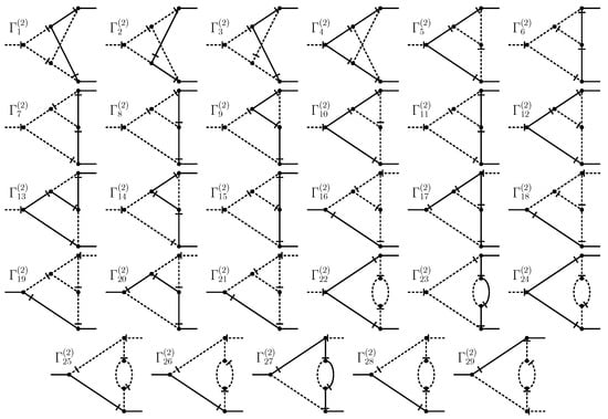 The results on coefficients , , and , from Equation (39), which correspond to contributions of graphs depicted in Figure 3 and are multiplied by the appropriate symmetry factors. The zeros in the column for at are explained by the vanishing of the corresponding tensor structure and in the column for values by the absence of a divergent subgraph in the diagram.