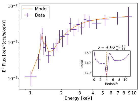 To reproduce what is observed in intermediate-to-deep X-ray surveys (e.g., [25,26]), we simulated column densities from to 25 with a step of 0.5, redshifts up to 9 with a step of 0.5, and different power-law normalizations to obtain a number of net counts (0.5–10 keV band) of up to 150. For each parameter combination, we simulated 200 spectra. The simulations were also repeated by excluding the Fe K emission line to mimic cases in which no line is detected. The expected background, which comprises both particle (non-X-ray) and astrophysical components, was properly modeled (see Appendix A for details) and associated with the simulated spectra. The most recent AXIS responses, ARF and RMF, were applied. The simulated spectra were binned to a minimum of 1 cts/bin to avoid empty channels, and Cash statistics [27] were applied. Following [4], after a first fit to assess the free parameters, the best-fit redshift estimates (XZs) were evaluated using the steppar command. This allowed for an evaluation of the possible best-fit solutions by running consecutive fits as a function of one or more parameters. We ran it as a function of z in the range [0–11], with a step of 0.01. The best-fit XZs were then determined to be the minimum value in the resulting statistical distributions. Finally, the model’s best-fit parameters were then compared to the simulated values as described in Section 3. An example of this procedure is shown in Figure 1.