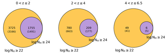 Predicted number of reliable XZs in the combined deep (7 Ms) and intermediate (375 ks) planned AXIS surveys [13,15,16]. The three Venn diagrams show different redshift bins, while the orange and purple circles show the expected numbers of XZs for 22 and 24, respectively. The provided numbers represent our projections based on a model with a 6.4 keV K emission line, while the values within the parentheses indicate the scenario in which no emission line is detected.