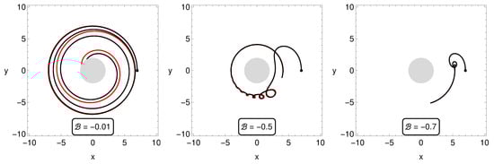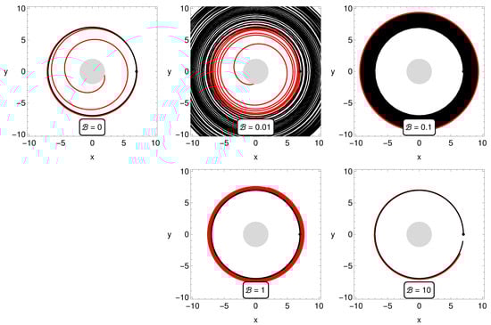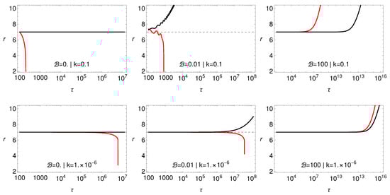 In Figure 3, we illustrate dependence of the influence of the tail term on the role of the back-reaction forces in dependence on the magnetic parameter  and the reaction parameter k. When external magnetic field effect is not present () the particle without tail influence will stay on circular orbit. When the tail will be included, the particle will fall into the black hole with time of black hole capture depending on radiation parameter k. This scenario will remain valid for low values of external magnetic field (), but when external magnetic field is large () the orbital widening is reported for both trajectories with or without the tail term influence. Clearly, the combined effect of both  and k is relevant and the appearance of the orbital widening effect occurs for a high enough .