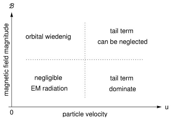 When no external magnetic field is present or the magnetic field is very weak, gravity and the tail term remain, and the tail term cannot be neglected. In this case, the statement of [] is applicable. However, even if a magnetic field of the order of a few Gauss arises, the LF and RR forces overcome the tail term by several orders of magnitude. Therefore, one can conclude that the tail term can be ignored for the dynamics of elementary particles in many astrophysical situations but can be relevant in other situations, depending on the ratio of relevant parameters, as demonstrated in Figure 4.