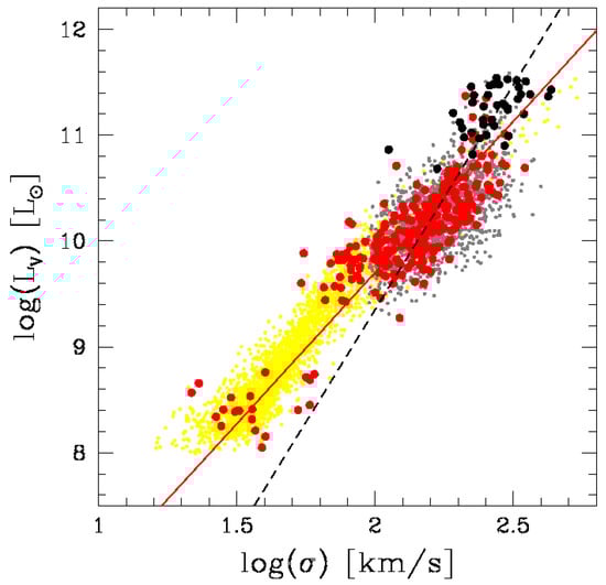 The extended FJ law might imply that the luminosity of galaxies L depends, although in a mild way, on the velocity dispersion . Such ideas can be draw back to Brosche [], who first suggested a failing of the simple law of star formation Schmidt [], based only on the gas density , favoring a scenario in which star formation is a function ∼, where v is the velocity of stars and is a variable parameter. The stars born in large gas aggregates have a characteristic velocity that depends on the physical condition of the galaxies during the star forming event (collapse, shock, merging, etc.). For this reason the global star formation and consequently the total luminosity of galaxies might keep a memory of the velocity of this gas, and later on, of the velocity dispersion of its stars. This opens the possibility of a “physical” connection between L and , leaving to the classical FJ relation the meaning of a “translation” of the relation, obtained substituting the mass M (difficult to measure) with the luminosity L (easy to measure).