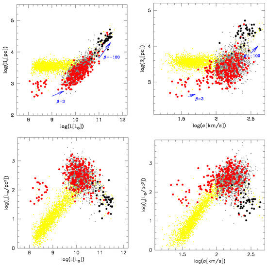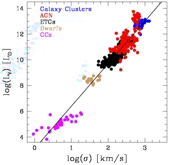 When we leave the domain of ETGs we discover that L and correlate also in other physical contexts. It is well known that in young massive star clusters, where giant extra-galactic HII regions exist, a correlation between luminosity and width of the emission lines is observed; this is the L() − relation [] between the luminosity of the Hβ line and the velocity dispersion of the HII gas. The scatter in this relation is small enough that it has been used as a distance indicator [,,,,,]. One key property is that, when the mass of the young cluster increases, both the number of ionizing photons and the motion of the ionized gas increase. The HII feature in the optical spectrum is visible out to z∼3.5 and, according to Koo et al. [] and Guzman et al. [], a large fraction of compact star-forming galaxies at an intermediate redshift have a similar L() − of local galaxies. Bordalo and Telles [] explored the correlation and its systematic errors in the redshift range (), concluding that something close to a power law () is observed when objects with Gaussian emission line profiles are considered. The root mean square (rms) scatter they measured is ∼0.30.