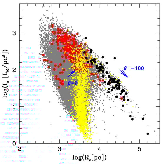 In addition to real data, we have used the artificial data of the Illustris simulation (see, e.g., [,,]). This dataset contains ∼2400 galaxies and is marked in all plots by yellow dots. A full description of these data is given in [,]. We used the run with full-physics (with both baryonic and dark matter) having the highest degree of resolution, i.e., Illustris-1 (see Table 1 in []), extracting the -band luminosities of the galaxies, their mass, velocity dispersion, half-mass radii of the stellar particles, morphological types, etc. The projected light and mass profiles of ETGs have been studied in the paper of [], who computed the effective radius (Re) the effective surface brightness , the best-fit Sérsic index, and the line-of-sight velocity dispersion .