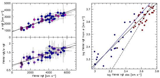 In addition, a FWHM predicted on the basis of the measured , FWHMσ was obtained by isolating the Population A sources from Table 3 of Dalla Bontà et al. [] to construct a relation yielding the FWHMM from . The procedure was similar to the one of Dalla Bontà et al. [] and involved the exclusion of outlying points with a 2.6 clipping criterion4. The resulting relation applied to our data is (Figure 4, right panel):