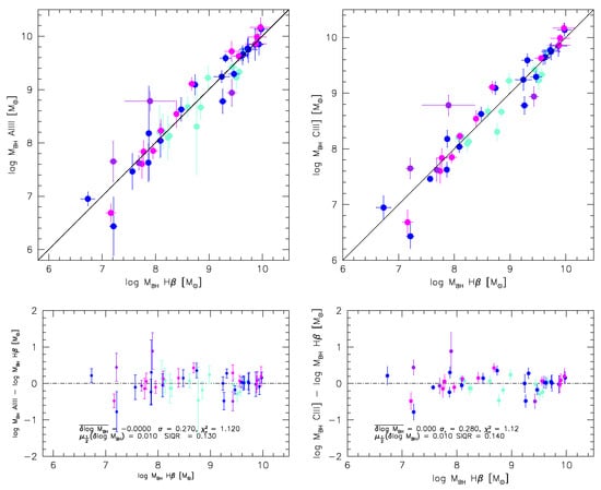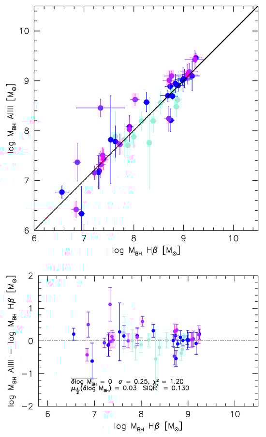 Decimal logarithm of black hole mass in units of solar masses computed from the relation of Equation (14) based on FWHM H vs. the one computed from the Aliii1860 FWHM following Equation (20). The bottom panel shows the parameters related to the differences. Different colors identify sources belonging to difference spectral types in Population A, in order of increasing : A1 (cyan, ); A2 (blue, ); A3 (magenta, ); A4 (purple, ).