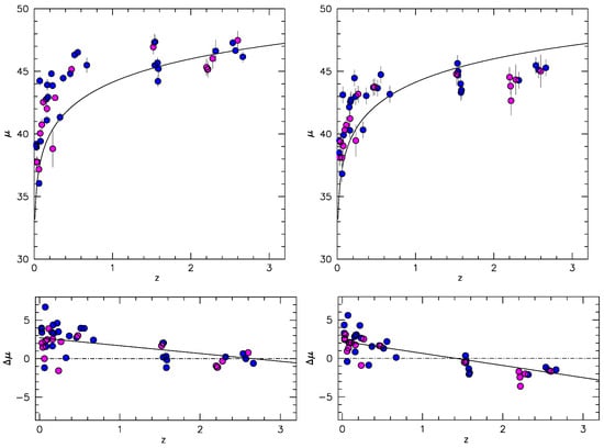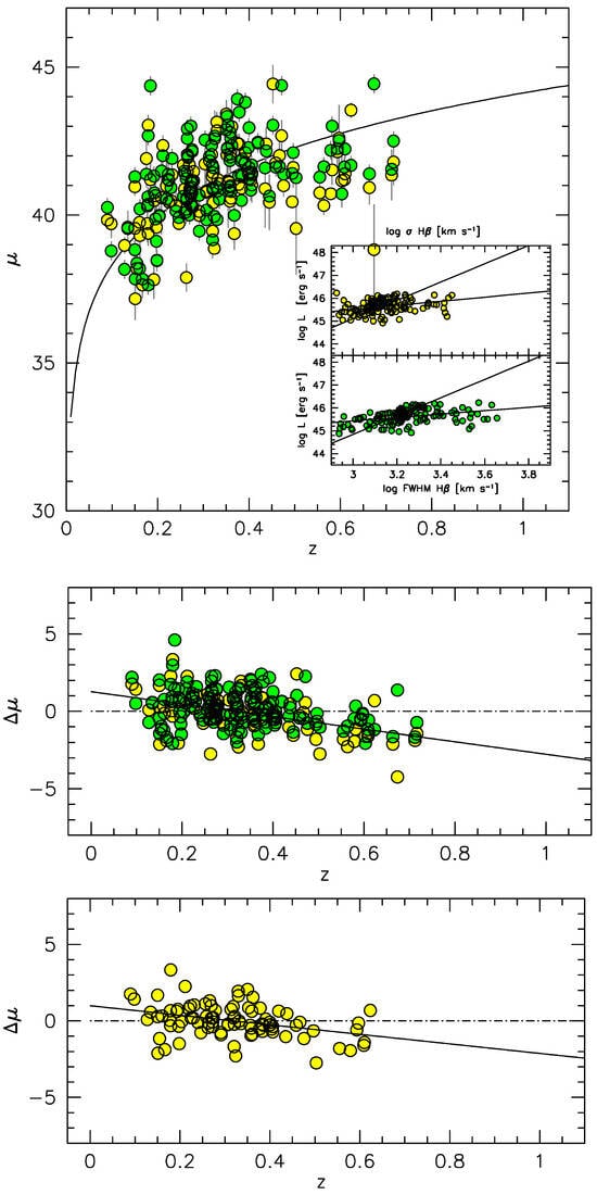 So, it is perhaps not surprising that the formulation of a FJ-like law in the context of AGN has a relatively recent history. Regarding the use of a FJ law as a luminosity indicator, one has to first consider that quasars are the opposite of standard candles, since their luminosity is spread over more than five orders of magnitude (see the interviews on the exploitation of quasars as distance indicators in []). Attempts to define correlation between spectral parameters and luminosity have been systematically frustrated by the increasing dispersion that arose when samples of increasing size have become available. A case in point is the Baldwin effect [,,], a luminosity trend that becomes shallower and statistically weaker with an increasing sample size. A connection between quasars observational and accretion parameters has become possible only after the systematic organization of the diverse spectral properties along an easily identified sequence (the so-called Eigenvector-1 sequence or quasar main sequence [,,,]). Since then, two main populations and several spectral types along the sequence have provided contextualization for most type-1 AGN [,], in both low and high luminosity samples [,]. The distinction between the two populations—conventionally named A and B—is rooted in systematic differences in terms of Eddington ratio, which in turn translates into the possibility of two different accretion modes [,]. Of special interest is a spectral type at one end of the quasar main sequence (MS), characterized by the most intense optical singly-ionized iron emission [,]. Even if the strong Feii emitters have been studied systematically since the 1990s [,,], the association of Feii emissions with a high Eddington ratio is a more recent result [,,,,]. At very high accretion rates, a geometrically thick, optically thick disk is expected to develop, with the accretion flow becoming advection-dominated [,]. As a consequence, the Eddington ratio tends asymptotically to values of order unity [] for a dimensionless accretion rate , where is the mass accretion rate and L is the quasar luminosity. This important result is at the basis of the exploitation of a quasar FJ-like relation for cosmology (as will be amply discussed below), and confirms that the luminosity follows a dependence on line broadening consistent with the virial theorem, at least for Population A sources. Finally, a luminosity versus velocity relationship is also possible for type-A AGN.