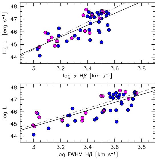 A word of caution is that the highest luminosity covered by Dalla Bontà et al. [] is [erg s−1]. The majority of our sources (red circles in Figure 4) are above this limit. The FWHM predicted from the is larger than the observed one, especially for the narrowest H profiles: the constant term ensures that FWHMσ ≳ FWHM for all reasonable FWHM values; the largest mass estimates would be unaffected since FWHMσ ≈ FWHM if FWHM ≈ 7000 km s−1, an extremely large value considering the luminosity-dependent maximum FWHM for Pop. A sources []. This result is potentially interesting as it is likely that the narrowest profiles are the ones most affected by an almost pole-on orientation. The simplest use of Equation (12) would be to substitute it in the H relation of Vestergaard and Peterson []. The scaling law would then become: