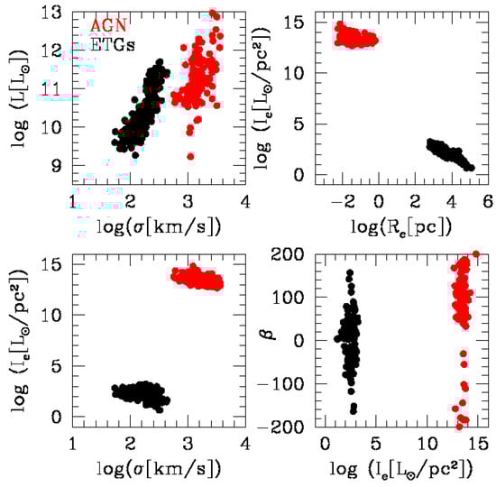 The plan of the paper is as follows. In Section 2 we briefly review the state of the art of the relation both for ETGs and AGN. In Section 3 we deal with ETGs in some detail, present the observational data and the Illustris galaxy models we have adopted, discuss the classical FJ relation, examine the four possible projections of the FP and the distribution of galaxies in these projection planes, and report on the results obtained with the time-dependent FJ relationship. In Section 5 we address the subject of AGN, describe the two populations of AGN, the current estimates of the masses of central Black Holes, different estimates of the velocity dispersion and corrections of this by different effects, and finally derive luminosity versus velocity dispersion relationships for two groups of so-called population-A AGN. In Section 5, we apply the formalism developed by D’Onofrio et al. [] to derive the variables and to our group of AGN, pointing out the remarkable similarity in the scaling laws for AGN and ETGs. Lastly, in Section 6 we summarize the results and present some conclusions. Finally, in Appendix A we present some details on measuring the velocity dispersion in xA sources.