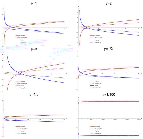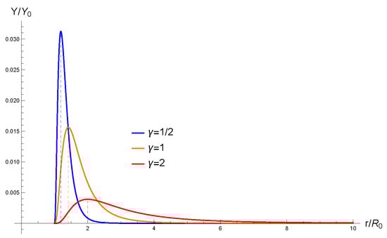 As is evident from this classification, there are three values of the parameter , corresponding to , that require a separate discussion and will be considered later. We will address the features of the general case first. For this purpose, we focus on the radial dependence of the function defined in Equation (23). Since (19) allows us to write