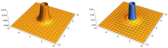 Left: three-dimensional representation of the kinetic term when for the case . Right: same representation for (blue) and (orange). Note how the more compact solution is always hidden by the one except at the innermost region. The different amplitudes of the maxima are also evident in this plot.
