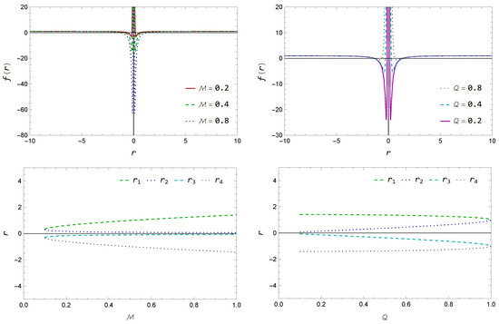 Top panel: The metric function with and varying parameter (left), and with and varying parameter (right). Bottom panel: The horizons with as functions of the BH’s mass (left), and with as functions of the BH’s charge (right).