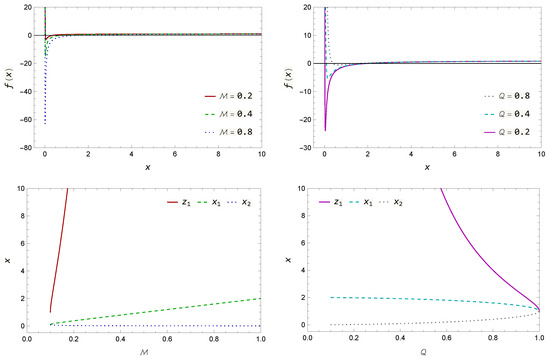 To solve the radial Equation (43), first, we need to find a more convenient form (parametrization) for the metric function given by Equation (10). In fact, the left-hand side of surface Equation (13) is a biquadratic equation, and we can “reduce” the number of singularities by defining a new radial coordinate, x, as