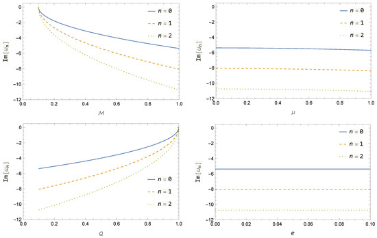 Top panel: The imaginary part of the charged massive scalar QBSs of a five-dimensional non-extremal Reissner–Nordström black hole with respect to and varying the BH’s mass (left) and the field’s mass (right). Bottom panel: The imaginary part of the charged massive scalar QBSs of a five-dimensional non-extremal Reissner–Nordström black hole with respect to and varying the BH’s charge (left) and the field’s charge e (right).