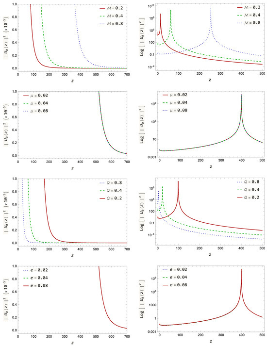 The squared radial wave eigenfunctions (left) and their log-scale plots (right) for the fundamental of charged massive scalar QBS frequencies in a 5DRNBH spacetime as functions of , , , and e. The units are in multiples of .