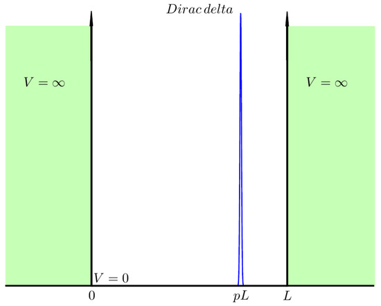 Here, represents the Hamiltonian of the particle within the ISW, governed by the kinetic energy term and the potential energy function , which is zero within the well and infinite elsewhere. The additional term introduces the effect of the impurity, modeled as a delta function potential with strength denoted by . The parameter p determines the precise location of the impurity within the well. A negative implies a repulsive impurity, behaving akin to a barrier, while a positive denotes an attractive impurity, creating a well-like potential. The schematic representation of the ISW potential featuring a repulsive impurity is depicted in Figure 1. In this section, we will present the eigenvalues in four cases, leaving the details for Appendix A.
