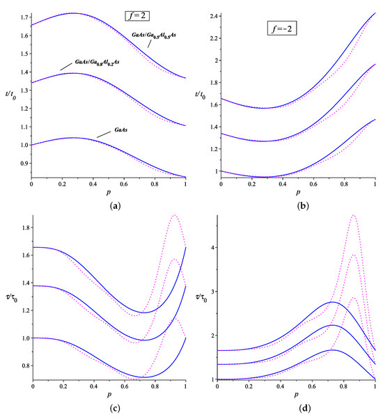 In Figure 5, we present a density plot of the calculated times for the first-order energy correction in the weak regime coupling with impurity. We show only the case for electrons in GaAs because altering the aluminum concentration, temperature and pressure results in an increase in effective mass, thereby increasing these times. For any other case, the profiles of these density plots remain the same. Firstly, we plotted the graphs for because, for f smaller than that up to , the times have negative values and even divergences. Therefore, our study also suggests that the work [17] is better applied for values of this coupling constant . As we can see, quantum revivals exhibit interesting behaviors for electrons in a quantum box, and the position of the impurity significantly affects them. From these plots, we observe that the classical periods and quantum revival times are either maximum or minimum in well-defined regions, depending on the values of f and p involved. In Figure 5a,c, which correspond to positive values of f, the orange regions indicate the maximum values of these times, while the purple regions indicate the minimum values. For negative f, Figure 5b,d, the red colors indicate the regions where the classical period and quantum revival times are maximum, while the orange regions indicate the minimum values for them.