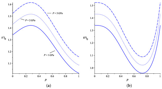 The energy levels are inversely proportional to the effective mass of the electron in the box. Therefore, any increase in its value results in increased calculated times, as they become proportional to it. We consider the case , as this is the value of n for the largest values for these times. We analyze the classical periods and revival times versus the position of the impurity for the weak-coupling regime in Figure 2. As the concentration of Al increases, the profile of the graphs does not change, but the times are increased. The same occurs for an increase in hydrostatic pressure (see Figure 3). The effects of temperature on the effective mass are the least pronounced, so we will not plot them here. For , the graphs show that the times behave non-monotonically as a function of the impurity’s position within the box and in the opposite way. For a classical period and , the lowest value of time occurs when the impurity is close to the infinite wall on the right, while the highest value is near . For , this behavior inverts. As for the revival time, the highest value occurs when the impurity approaches the infinite wall on the left, while the lowest value is near . The inversion in this behavior is also observed for . Notice that the classical periods calculated from the energy derived from second-order perturbation theory deviate, in , towards slightly smaller values compared to the case for first-order perturbation. For the revival time, there is a peak time near , but perhaps this region may not represent a physical value to be observed. Including more terms in the expansion could correct this situation, but we leave this open-ended.