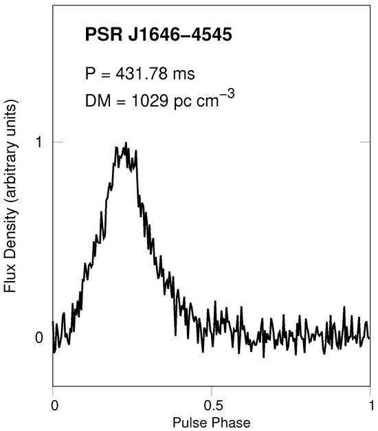 Integrated pulse profile of PSR J1646−4545 obtained by summing 24 bright detections of the pulsar at a central frequency of 1374 MHz and with a bandwidth of 288 MHz.