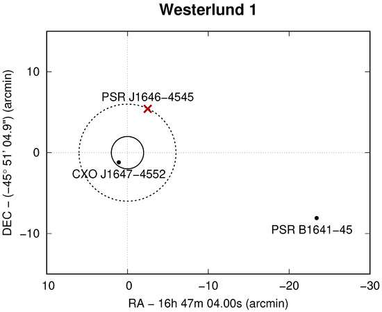- Muno, M.P.; Clark, J.S.; Crowther, P.A.; Dougherty, S.M.; de Grijs, R.; Law, C.; McMillan, S.L.W.; Morris, M.R.; Negueruela, I.; Pooley, D.; et al. A Neutron Star with a Massive Progenitor in Westerlund 1. Astrophys. J. 2006, 636, L41–L44. [Google Scholar] [CrossRef]