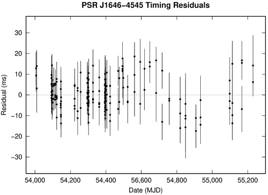 Timing residuals of PSR J1646−4545. The leftover unmodeled trend, visible in the residuals, is likely due to timing noise.