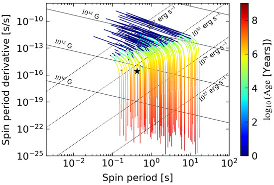 Evolution of synthetic pulsars in the P- diagram over 1 Gyr, taking into account B-field evolution (adapted from Michele Ronchi’s PhD thesis; see also [42,43]) The black star indicates the position of PSR J1646−4545 in the diagram.