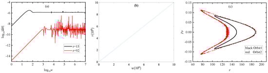 The integration time step is . The parameters are , , , , and . The initial conditions are and . The initial separation are for Orbit 1 and for Orbit 2. The initial value of is given by Equations (15) and (16). The method yields no secular growth in the Hamiltonian errors of the two orbits in Figure 1a. This result is fit for a property of a symplectic integrator. When the integration lasts steps, the proper time and the new time w are almost the same, as shown in Figure 1b.