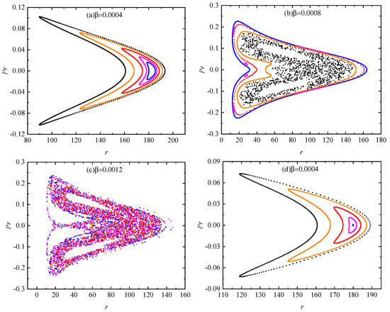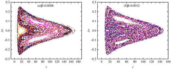As mentioned above, the technique of Poincaré sections is a good description of phase space structures in the system (15) or (20). Taking the parameters , , and , we plot Poincaré sections for three values of the magnetic parameter 0.0004, 0.0008, 0.0012 in Figure 2a–c. The plotted five orbits of charged particles around the RGI Schwarzschild black hole are regular for 0.0004 in Figure 2a. Only one of the five orbits is chaotic for 0.0008 in Figure 2b. However, the five orbits are chaotic for 0.0012 in Figure 2c. These facts show that the occurrence of chaos becomes easier as the magnetic parameter increases from a statistical viewpoint of the global phase space structure. The result on a larger value of the magnetic parameter easily inducing chaos is also suitable for the Schwarzschild case with in Figure 2d–f. Comparing the two cases of an RGI Schwarzschild black hole and a Schwarzschild black hole, we find that the five orbits are regular for 0.0004 in panels a and d, but chaotic for 0.0012 in panels c and f. Chaos seems to be stronger in panel f than in panel c. In fact, an explicit difference between the two cases is that for 0.0008, only one of the five orbits is chaotic in the RGI Schwarzschild case in panel b, whereas the five orbits are chaotic in the Schwarzschild case in panel e. Thus, for a given magnetic field parameter under some circumstances, chaos seems to be much easily induced in the Schwarzschild black hole spacetime than in the RGI Schwarzschild black hole spacetime.