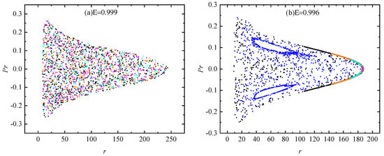 Letting the parameters be , , and , we continue to consider the motion of charged particles around the RGI Schwarzschild black hole. When the energies are given three values of , , and in Figure 3a–c, the decrease in the energy typically decreases the extent of chaos and even rules out the occurrence of chaos. However, the extent of chaos is typically strengthened when the particle’s angular momentum L decreases from in Figure 3d to in Figure 3e and to in Figure 3f, where the parameters are , , and . Similar results exist as the renormalization group parameter decreases from in Figure 3g to in Figure 3h and to in Figure 3i, where the parameters are , , and .