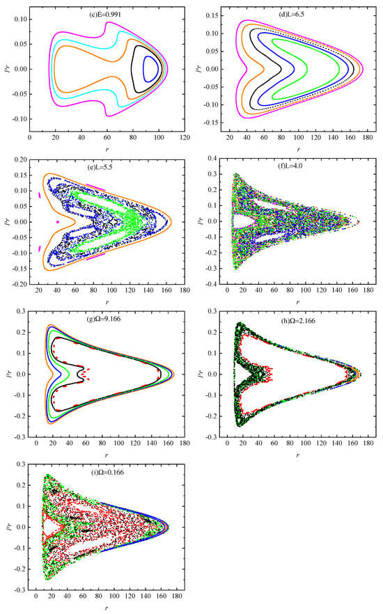 Poincaré sections. The parameters are , , and , but three different values of the energy are (a) , (b) , and (c) . The parameters are , , , and , but three different values of the angular momentum are (d) , (e) , and (f) . The parameters are , , , and , but three different values of are (g) , (h) , and (i) .