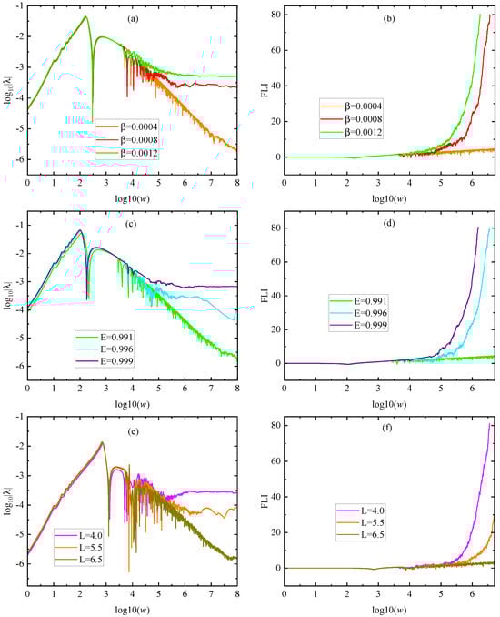 The FLIs that exponentially increase with time describe the onset of chaos for 0.0008, 0.0012 in Figure 4b, while the FLI that algebraically grows with time indicates the presence of order for 0.0004. The methods of and FLIs in Figure 4c–h display that a larger energy or renormalization group parameter has larger Lyapunov exponent and FLI for a given orbit, but a larger angular momentum corresponds to smaller Lyapunov exponent and FLI. Thus, the effects of the parameters E, L, and described by the methods of and FLIs are consistent with those given by the Poincaré map method in Figure 2 and Figure 3.