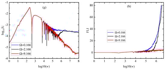 The maximal Lyapunov exponents and the Fast Lyapunov Indicators (FLIs). (a) and (b) FLIs for the tested orbit with the initial radius , and the parameters , , and , but three different values of the parameter . (c) and (d) FLIs for the tested orbit having the initial radius , and the parameters same as those of Figure 3a–c. (e) and (f) FLIs for the tested orbit with the initial radius and the parameters corresponding to those of Figure 3d–f. (g) and (h) FLIs for the tested orbit having the initial radius and the parameters same as those of Figure 3g–i.