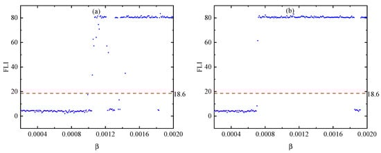 (a) Dependence of the FLI on the magnetic parameter in Figure 2a–c. The initial radius is . The FLI for a given value is obtained after integration time . The FLIs ≥ 18.6 indicate disorder dynamics, while the FLIs < 18.6 show regular dynamics. (b) Dependence of the FLI on the magnetic parameter in Figure 2d–f.