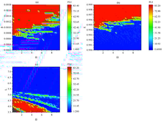 Distributions of two parameters corresponding to order and chaos via the FLIs for the tested orbit with the initial radius . (a) The two-parameter space is and the other parameters are , and . (b) The two-parameter space is and the other parameters are the same as those in Figure 3a. (c) The two-parameter space is and the other parameters are the same as those in Figure 3d.
