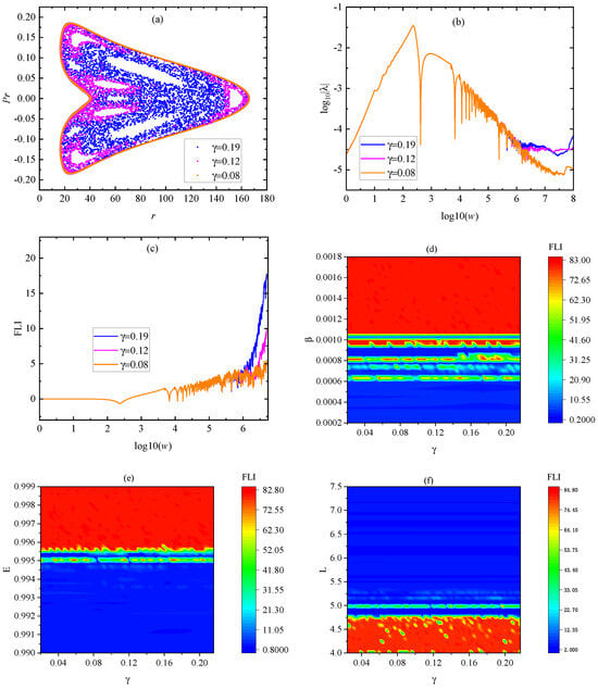 Now, let us consider the impact of the distance scale on the dynamical transition. When the starting separation and the parameters , , and are given, three values , 0.12, and 0.19 allow for the existence of chaos, as shown via the methods of Poincaré sections, Lyapunov exponents, and FLIs in Figure 7a–c. The dynamical transition is insensitive dependence on a variation of in the parameter spaces , , and of Figure 7d–f. The dynamical transition insensitive dependence is based on the parameter constrained in Ref. []. However, the ISCO radius increasing with the increase in the parameter in Ref. [] is due to the parameter dissatisfying this constraint.