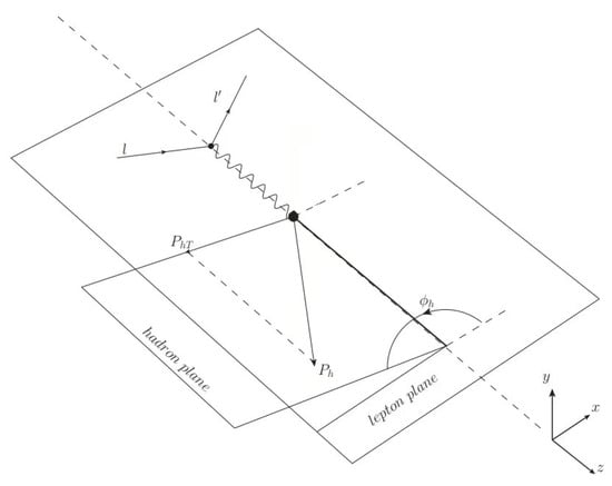 where S is the total center-of-mass energy squared, x is the Bjorken variable, y denotes the lepton (quark) energy–momentum transferring fraction, and z represents the longitudinal momentum fraction of the final fragmented hadron with respect to the parent quark; denotes the momentum of the virtual photon, with . The reference frame of the studied SIDIS process is shown in Figure 1, in which the z-axis is defined as the momentum direction of the virtual photon according to the Trento convention [35].