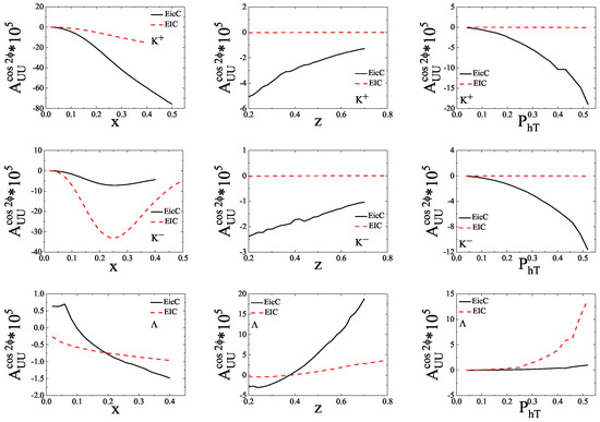 The results are shown in Figure 2: the upper, middle, and lower panels of the figure depict the numerical results of asymmetry times in the -, -, and -hyperon-produced SIDIS process in the kinematic regions of EIC and EicC, respectively. The left, middle, and right panels denote the asymmetry as functions of x, z, and , respectively. As can be seen from Figure 2, it can be found that azimuthal asymmetry in the charged-kaon- and -hyperon-produced SIDIS process is relatively very small compared with other asymmetries, such as Sivers asymmetry [41] and Collins asymmetry [61] in all cases in both the EIC and EicC kinematical regions, which shows that the convolution of the Boer–Mulders function may not be the main contribution of the asymmetries. The magnitude of the asymmetry may potentially be recognized as consistent with zero. However, the magnitude of the asymmetry in the -produced process is larger than that of the -produced process. The reason is that the constituent quarks of the meson are u and , and those of are and s. The relatively larger contribution of the valence quark Boer–Mulders function leads to the result . Another observation is that the asymmetry at the configuration of EicC is larger than that at EIC, which may be due to the fact that the configuration of EicC is more sensitive to the sea quark distributions. In the future, high-energy, high-luminosity electron ion colliders can provide a unique opportunity to extract information about the TMD distribution functions and fragmentation functions, clarify their flavor dependence, and disentangle the different contributions.