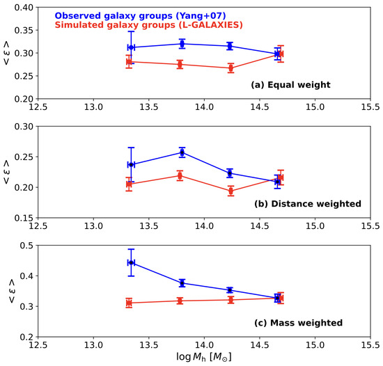 The comparison between average ellipticities of the observed (depicted in blue colour) and simulated (depicted in red colour) galaxy groups with the same group finder. Panels (a–c) correspond to Method (1), (2), and (3), respectively. The galaxy group samples are split into the different mass bins, within , , , and . Each point and the corresponding error bar represent the average ellipticity and error of the average value.