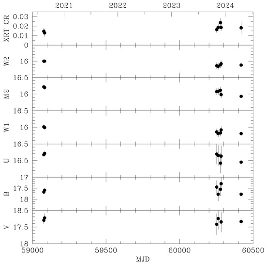 The background-corrected counts were converted into magnitudes in the Vega system using the latest calibration, as described by Poole et al. [71] and Breeveld et al. [82]. The magnitudes in each filter were determined with the UVOT tool uvotsource with the parameter apercorr set to curveofgrowth in order to compensate for the deviations from the calibrated circular 5 radius source extraction region in 2023. The data were corrected for Galactic reddening based on the reddening curves of Cardelli et al. [83] and using = 0.01. The extinction-corrected magnitudes are reported in Appendix A.1 of the Appendix A.