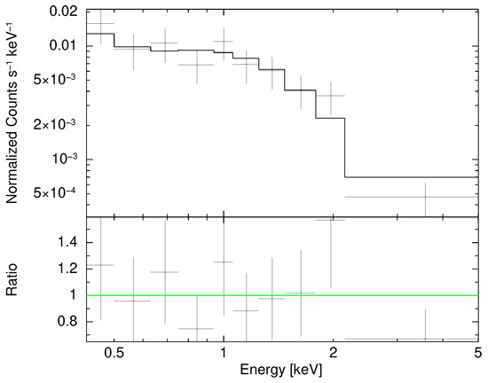 The X-ray data were obtained with the Swift X-ray telescope (XRT) [72] operating in photon counting mode [73]. To carry out the timing and spectral analysis, we selected source photons within a circular area with a radius of 20 detector pixels (one pixel corresponds to a scale of 2.36). Background photons were extracted in a nearby circular region with an extraction radius of 100 detector pixels. X-ray spectra of the source and background in the energy band 0.3–10 keV were generated. The spectral analysis was then carried out with the package XSPEC, version 12.14.0b [74]. The X-ray light curve is shown in Figure 1. Spectral fits were performed on the unbinned data and based on W-statistics [75,76] (W-stat hereafter).