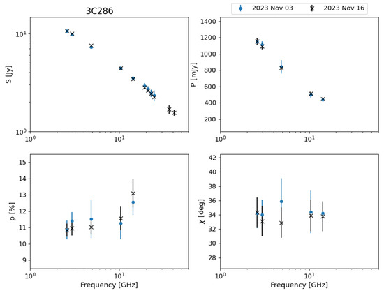 Radio observations of 3C 286 from November 2023. S is the flux density, P the polarized flux density, p the polarization percentage, and the polarization position angle. Measurements from November 3 are marked in blue and measurements from November 16 in black.