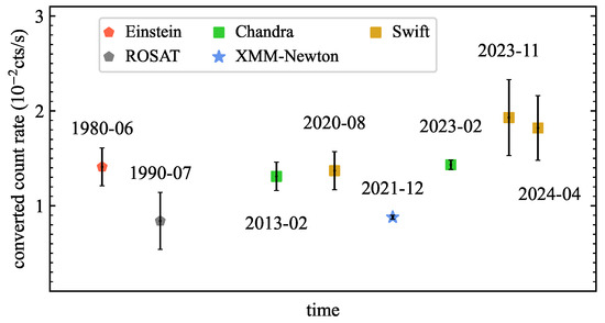 Long-term X-ray light curve of 3C 286 (displayed as Swift XRT count rate in the band 0.3–10 keV), observed with multiple missions between 1980 and 2024 (note that the time axis is not linear because of the widely spaced observations). All non-Swift data were first converted into fluxes in a homogeneous way and then into Swift XRT count rates (see text for details).