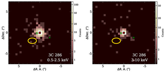An observation of 3C 286 with the Chandra ACIS-S detector [88] was performed on 12 February 2023 with a duration of 35 ks. The data will be discussed in more detail by Yao et al. [79], but we use them here to search for additional sources in the vicinity of 3C 286 separately in the soft and hard X-ray band (Section 6).