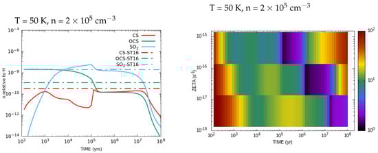 The abundances of sulphur-bearing species, such as SO, SO2, CS, H2CS and OCS, change significantly within yrs after the evaporation of ices when the ionisation rate is 1.36 . Our abundances obtained for the S-bearing species are comparable with the abundances observed from the LMC hot cores ST16, ST11, N113 A1 and N105-2 A. As described in [18,38], sulphur-bearing species originate from H2S since this was the most abundant sulphur-species at the initial condition. At relatively lower temperatures, for example, T = 50 K, the main destruction process of H2S is protonation by H3O+. The recombination of H3S+ produces SH and S, and the produced S reacts with OH to produce SO and SO2. At a chemical equilibrium state, SO can be formed from the reaction of SO2 with C. However, the sulphur element is originally from H2S.