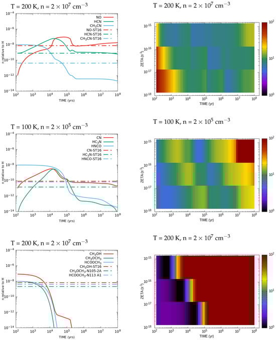 HCN is produced from the dissociative recombination reaction of HCNH+ with e−, while HC3N is formed from the reaction of H2C3N+ with an electron (as mentioned in [18] and from the reaction of CH2CCH with nitrogen. The abundance of CH3CN depends mainly on the abundance of HCN [18], and it is formed from the reaction of CH3CNH+ with an electron. In the gas phase, HNCO is formed mainly by the reaction of HNCOH+ and H2NCO+, each with an electron. If we did not input HNCO and CH3CN initially, the model calculations did not reproduce the observational abundance, as shown in Figure 5. Thus, we needed the initial HNCO and CH3CN abundances of to fit with the observations, suggesting that both HNCO and CH3CN are formed by grain surface reactions.