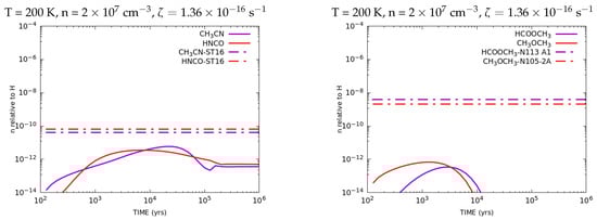 Temperature, density and CRIR affect the hot core chemistry significantly. Table 1 shows the values of the physical parameters that we used in our model. Since hot cores are formed as a result of the gravitational collapse of molecular cloud cores and the formation of massive stars at the centre of cores, which heat the surrounding materials, there are temperature and density gradients inside the hot cores, depending on their distance from the central stars. In order to cover the gradients, we set the temperature at 50 K, 100 K, 150 K and 200 K, and the density at , and [10,22]. The value of the visual extinction that we used in the model was 640 [17]. Therefore, photochemistry was negligible in this model since the visual extinction was large. The CRIR is defined as the total ionisation rate of molecular hydrogen. The value of CRIR included in UMIST code is the standard galactic value, which is . In the diffuse environment, the cosmic-ray ionisation rate can be higher (e.g., [23]). According to the Fermi LAT gamma-ray map, the global average CRIR in the LMC could be lower than that in the Milky Way, as low as ∼ [20,24]. However, due to the presence of about 60 confirmed SNRs in the LMC [25,26], the local CRIR value in a hot core could be as high as , when the hot core is located in the neighbourhood of SNRs [27]. In addition, some Galactic star-forming regions show a locally high CRIR (e.g., [28,29]) (see Section 4.1 for more details). Therefore, we varied the CRIR value between and [27] with an order of magnitude.