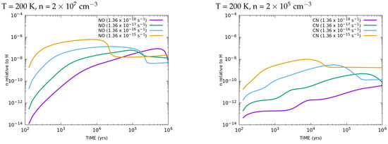 We note that when we compared the time evolution of molecular abundances between the Milky Way and the LMC elemental abundances, most of the molecules showed similar trends, but some of them showed the non-linear effects of chemical reactions. NO is one of the typical examples. Figure 6 shows the time evolution of NO and CN abundances, where we used the same physical parameters as in Figure 1, but with the initial abundances for a galactic hot core, as shown in Table 1 of [18]. The figure shows that the time evolution of CN abundance behaved similarly while that of NO abundance behaved differently based on the Milky Way and the LMC elemental abundances. Observations at different environments, especially with different CRIRs both in the Milky Way and the LMC, could help understand the formation pathways of N-bearing molecules in different elemental abundances.